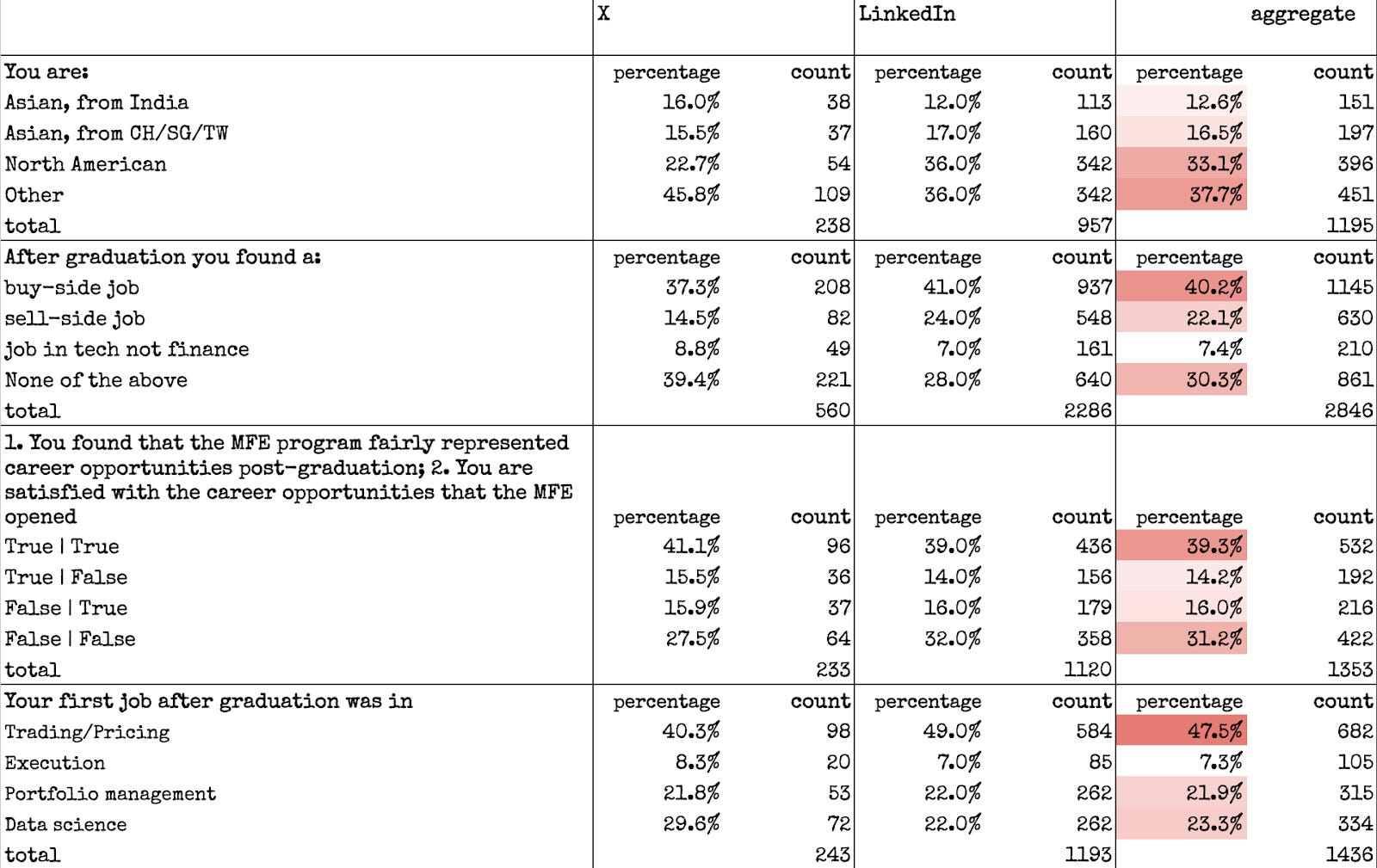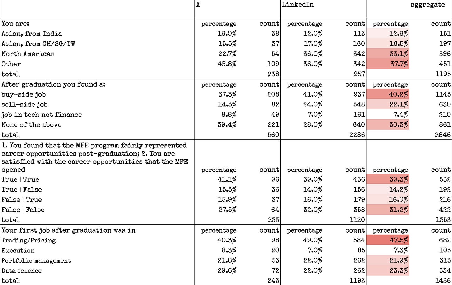 For MSFE students: the MSFE is often perceived as the one chance to get started in finance in the US. Is that true? There are more MSFE programs than Taylor Swift breakup songs in this world, so concern about market saturation is legitimate. Since I don’t trust school sources or “independent” advisors (incentives), I ran a poll on X and LinkedIn. I received a total of about 6,000 responses—not a small sample size, even if possibly a biased one. Take a look at the answers and make up your own mind. My reading of the data, partly informed by my hiring experience, is that the best programs do help students find jobs. And which programs are those? I can’t help much here. I would say that geography matters: NYU, Cornell, Baruch, Princeton, and Columbia have an advantage because of their proximity to New York–based financial firms.