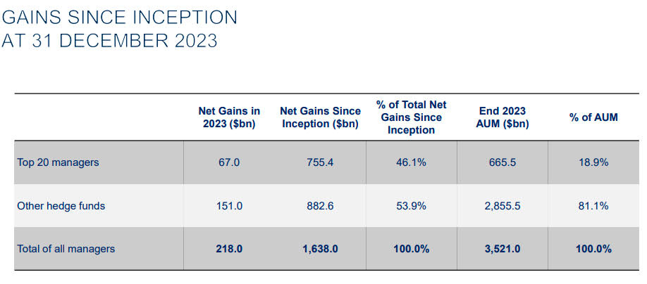 I will focus mostly on hedge funds and prop trading firms; they are also the only firms I know from direct experience. The first thing to realize is how tiny this segment is. The assets under management of the hedge fund industry are, give or take, $6T, out of roughly $125T of worldwide equity market capitalization. Prop trading firms are a rounding error relative to that $6T. The order of magnitude of hedge funds operating globally is about 30,000, but the distribution is heavy-tailed. Since inception and as of 2023, the top 20 hedge funds have generated about 19% of total profits (out of perhaps 100,000 hedge funds ever in existence). In the past three years, the top three hedge funds (Citadel, Millennium, and D. E. Shaw) have generated 38% of total PnL.