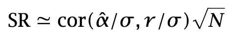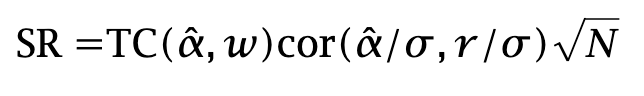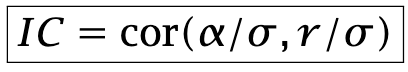 are zero, or very close to zero. Positive and negative positions should be approximately equal in number, and risk-adjusted net exposure should be approximately zero. The fraction can be interpreted as a correlation between risk-adjusted alphas and returns. Grinold calls this correlation the Information Coefficient: