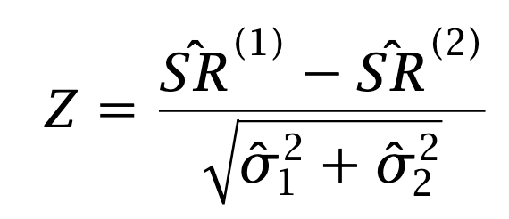 is distributed like a standard normal. The strategies, however, are not independent: their excess returns are paired. The correlation between the strategies is typically positive, and we can take advantage of that. The idea is to derive a statistic for the difference in Sharpe ratios under the assumption of paired observations. Such a statistic was derived by Jobson and Korkie in the large-sample asymptotic case3. The thrust of the paper is to compute a Taylor expansion of the statistic; the name for this technique is “delta method” and it is described in any asymptotic statistics textbook4. In The thrust of their paper is to compute a Taylor expansion of the statistic; the name for this technique is the delta method, and it is described in any asymptotic statistics textbook.