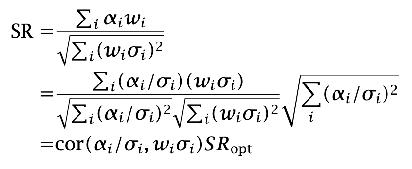 There are two statements that this result does not imply. First, it does not follow that adding constraints always results in Sharpe degradation. In fact, when predictions are inaccurate, side constraints can ex ante improve the Sharpe ratio. As a simple example, consider an extreme case in which the investor has a grossly inaccurate set of volatility predictions. As a result, the sizing of optimal positions from mean–variance optimization is severely distorted. The optimizer may then choose to add a side constraint of the form ∑iwi2 ≤ L. verror in the volatilities. Secondly, it does say that