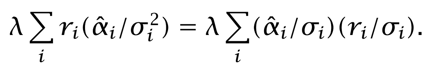 Start with the simplest setting. There are N assets and two periods. You purchase assets in period one and receive a random payoff in period two. The random returns ri are independent of each other and have mean αi and volatility σi. The assumption of independence is not unrealistic: you can think of these as idiosyncratic returns. Alternatively, you can interpret the assets as factors with independent returns, which always exist given a factor model. If that statement makes no sense to you right now, ignore it for now—and let me know if you would like to know more (it’s okay not to).