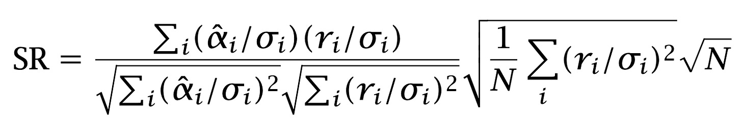 The Sharpe Ratio is the product of two factors. The first one is an intensive quantity. It does not depend on the number of assets. It is indicative of skills. The other one is an extensive quantity: it scales like the square root of the investment universe.