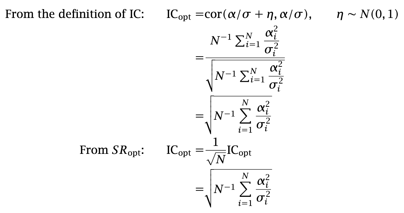 The quantity SRopt is the highest possible Sharpe ratio, achieved when forecasts are proportional to the true expected returns. We compute the corresponding ICopt in two ways:
