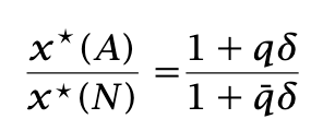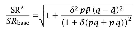 A small caveat. Suppose SA = -1 and SN = 1. Then δ = -2. And assume we have perfect foresight: q=1. Then the ratio of the optimal volatilities is -1. Of course: you know with certainty that the anomalous Sharpe is the opposite of the normal one, so you simply take the short position in the strategy. In other words, the correct interpretation of x* is that of a signed volatility.