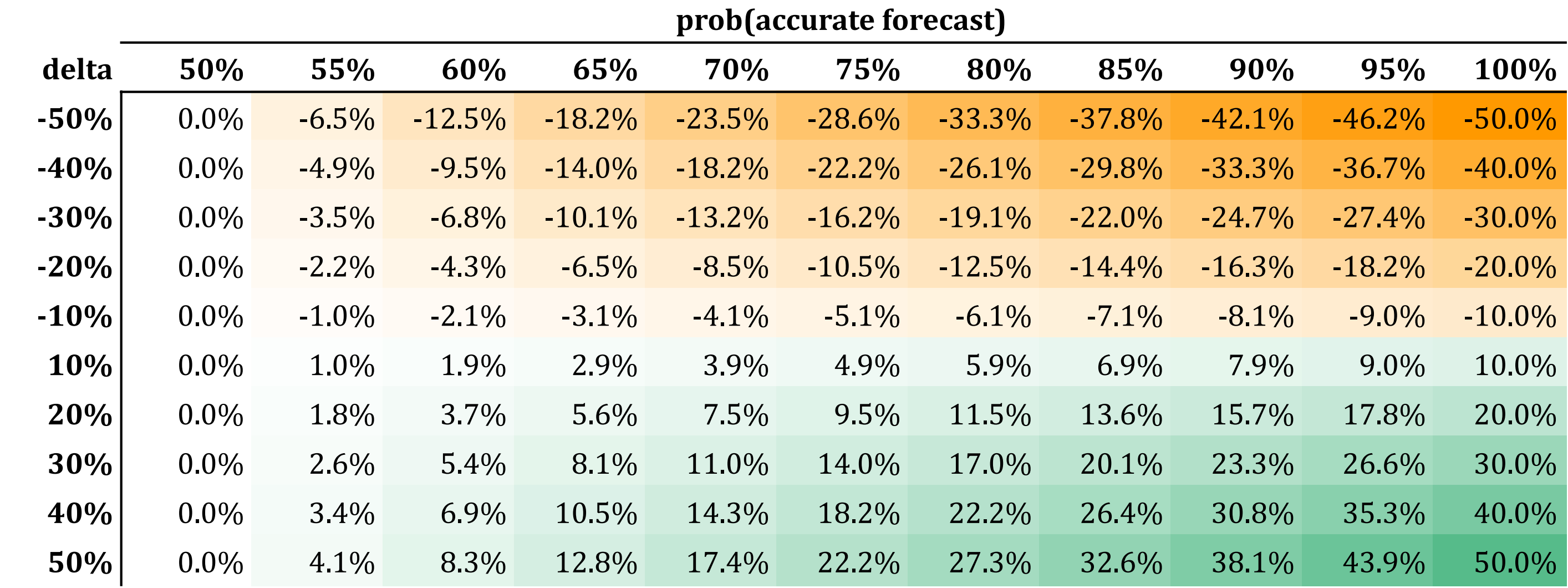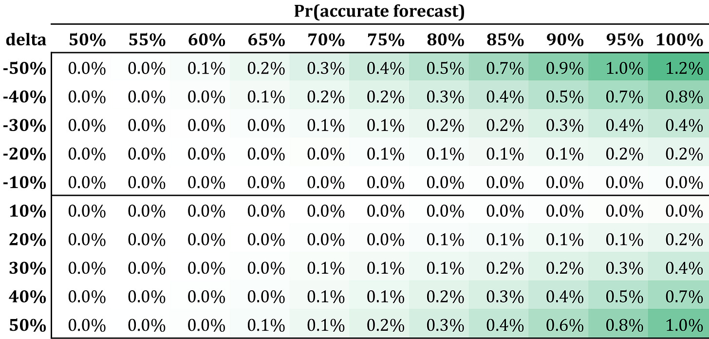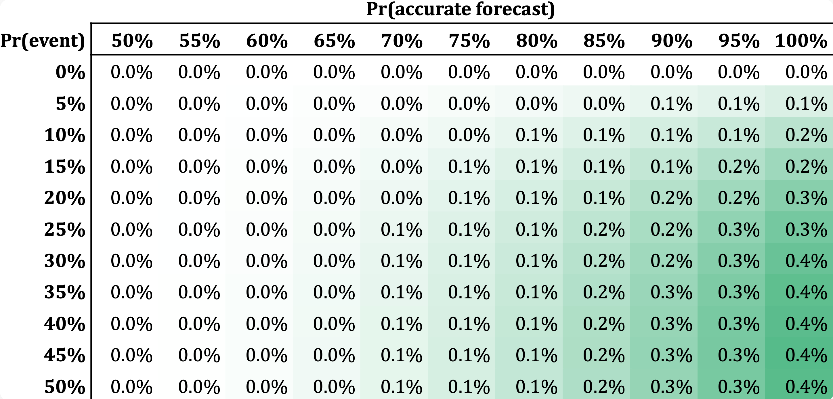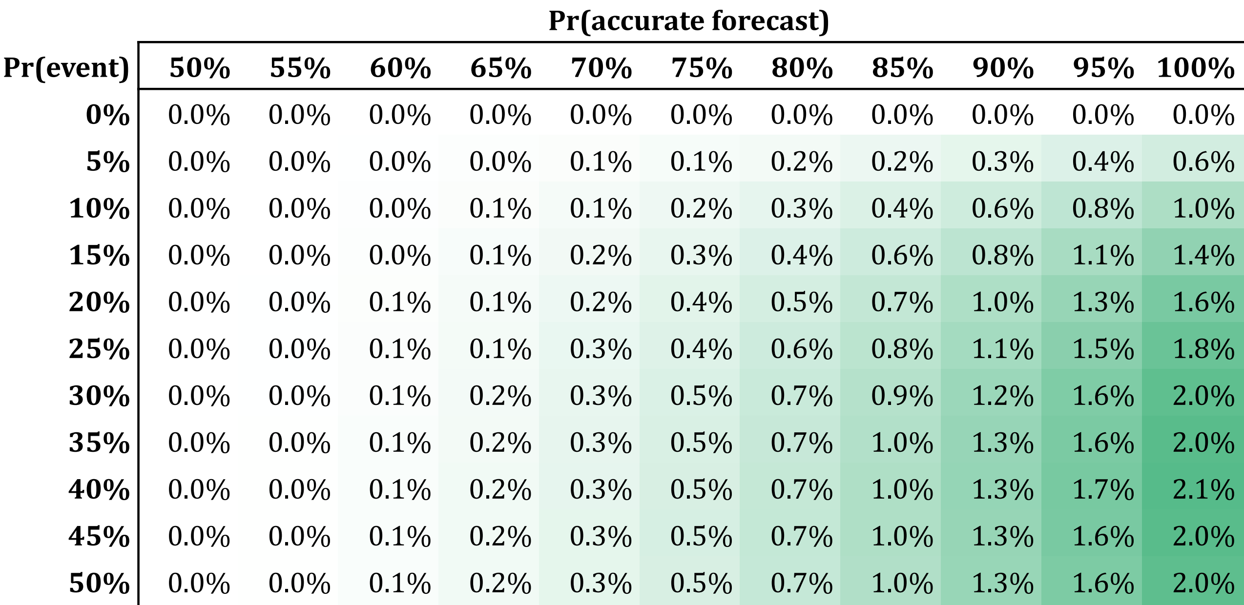 This also sense-checks, though it is less obvious. You need to have an edge in forecasting (q != 50%). This also sense-checks, though it is less obvious. You need to have an edge in forecasting Notice that if you are bad at forecasting, i.e., q < 0.5, , you are actually good at forecasting that an anomaly will not be present.