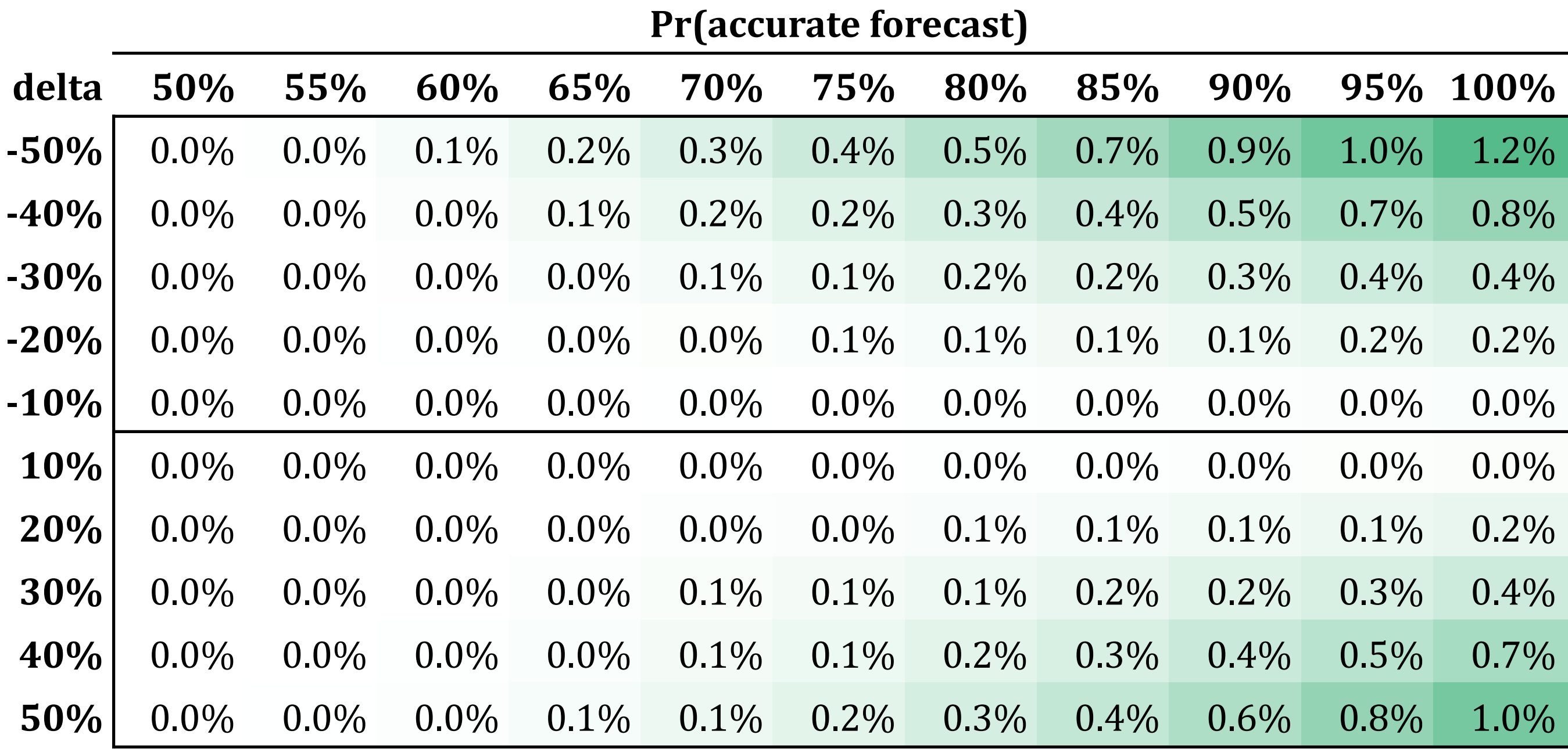 A similar, but distinct, example is one in which we receive an out- or underperformance signal for a factor. For instance, we may have an indicator of a possible degradation. These signals are low frequency and can imply large deviations from the expected Sharpe ratio of the factor. We consider the case p=10% with the anomalous Sharpe ranging from -50% to 50%. The table below shows the results for several levels of forecast accuracy. In this case as well, we find that the benefits from timing are modest, peaking at about 1.2%.