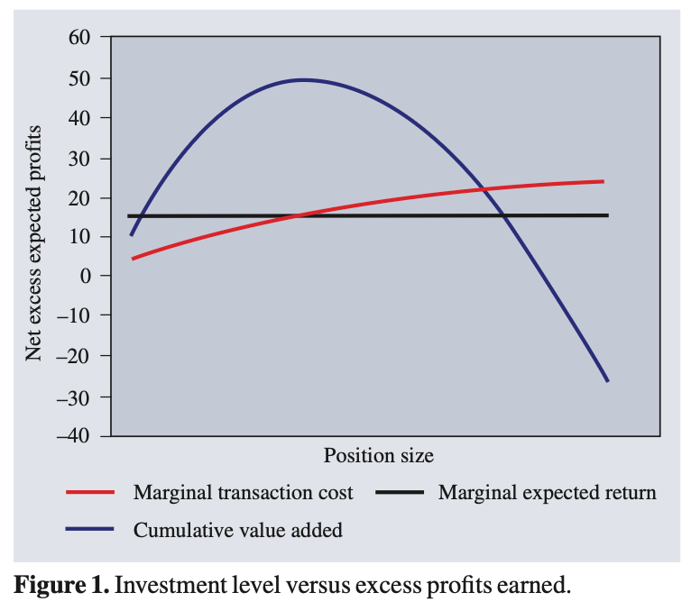 Investment strategies have fixed capacities. As I increase the money invested in a strategy, my expected transaction costs increase while my pre-transaction cost estimate of expected return stays constant. Figure 1 shows an example of this—once my marginal expected return, net of transaction costs, crosses zero, increased investment in a strategy only loses money.
