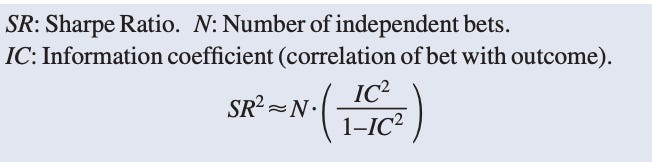 A strategy’s Sharpe Ratio is proportional to the number of independent bets taken by the strategy multiplied by the correlation of those bets with their outcome (figure 3). To get a higher SR, you need to increase the number of your bets or increase the strength of your forecasts.