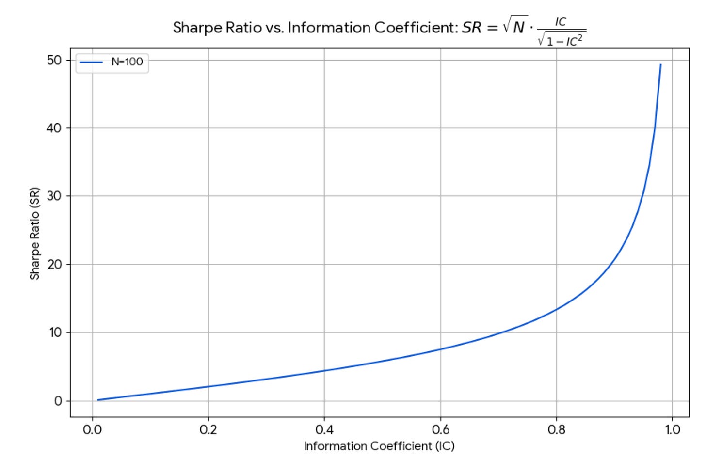 For small IC (IC < 0.4, which is still very high!), the formula is linear and is well approximated by Grinold’s formula. For large IC, the Sharpe Ratio explodes. See the picture below.