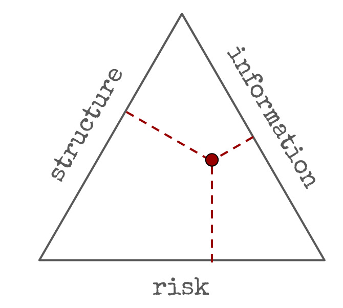 I find it useful to think about alpha as being a combination of three idealized mechanisms: information ("investing"), structure ("trading") and risk ("risk premia"). Something like this: