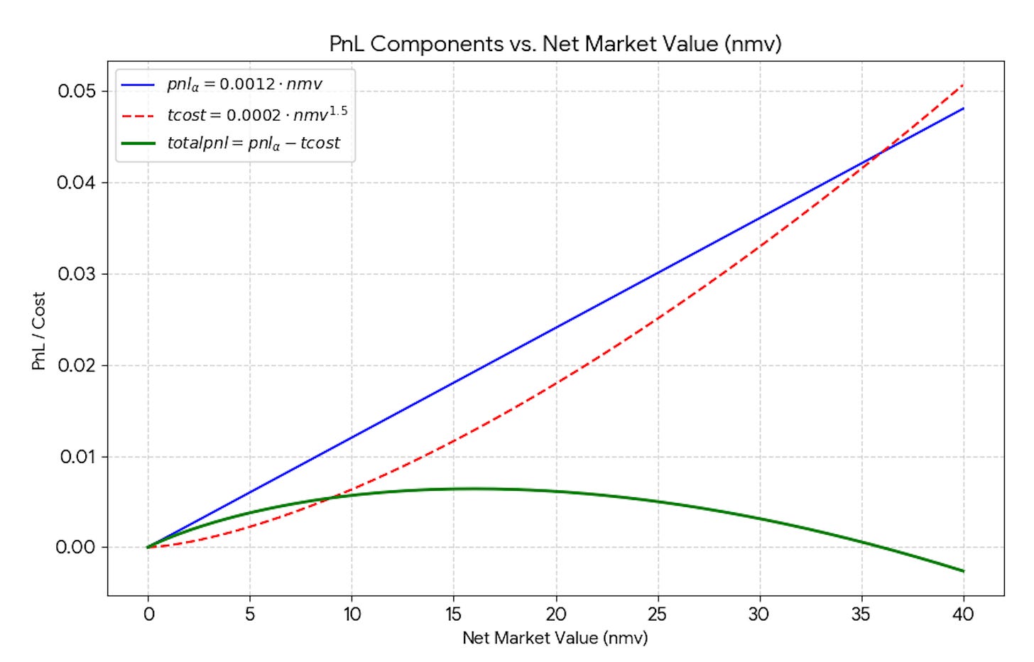 Here’s a toy version. Suppose NVIDIA is expected to gain 0.12% over the next two weeks. You must position for that date. Let www be the NMV you deploy in NVDA. Expected gross PnL (pre-costs) is 0.0012·w .Unit transaction costs are not linear. They are proportional to √w. These are not marginal costs. They are average costs. Let us make an example. You trade $20M. The costs are 0.0002*sqrt(20)*$20M = $17.9K. Unit costs are 0.0002 * sqrt(20) = 9bps. If you trade $40M, trading costs are 0.0002 * sqrt(40) * $40M = $50.6K. Unit costs are 0.0002*sqrt(40)=12.6bps. Both the first and the second $20M pay 12.6bps. The PnL reaches a maximum, and then decreases to the point that it becomes zero, or negative.